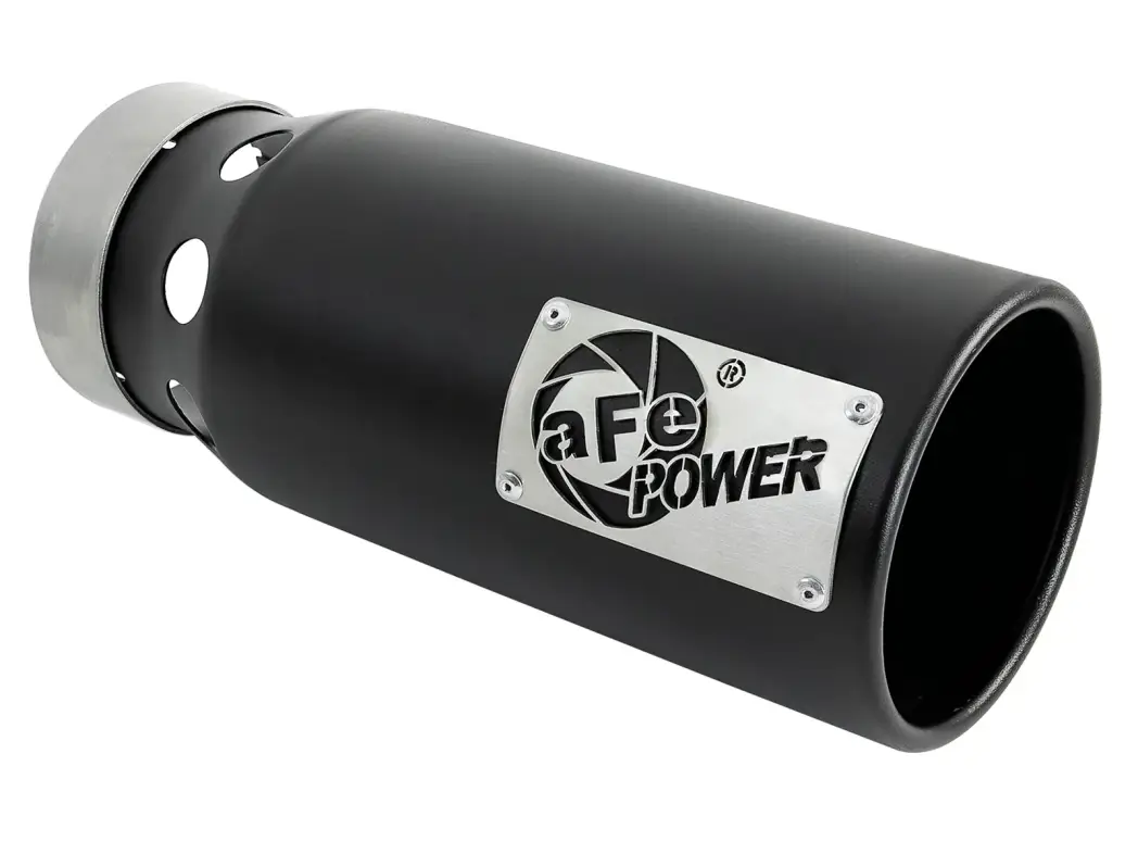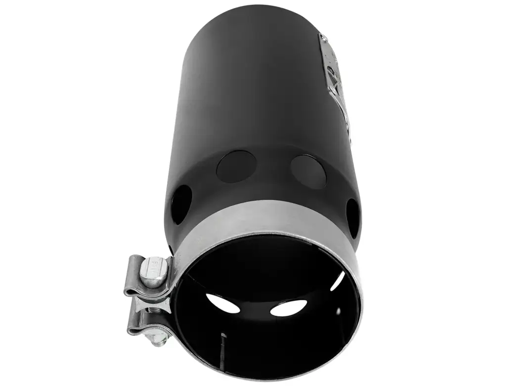 aFe Power is proud to introduce an all new intercooled exhaust tip. This tip comes with a black finish and is designed to fit 4" exhaust systems. With a 4" inlet x 5" outlet and 12" inch length, this single-walled, angle cut rolled tip comes with intercooling vents and a unique laser-cut aFe Power logo plate riveted on for an aggressive style.