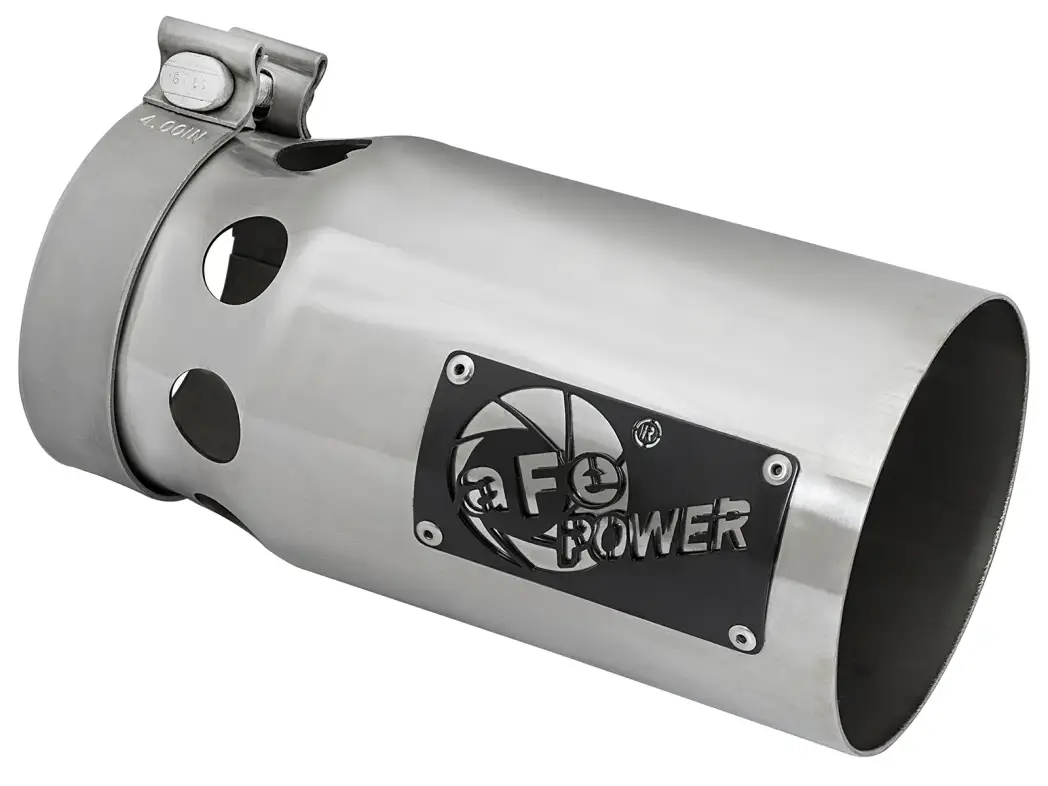 aFe POWER is proud to introduce an all new intercooled exhaust tip. This tip comes with a polished finish and is designed to fit 4" exhaust systems. With a 4" inlet x 5" outlet and 10" inch length, this single-walled, straight cut tip comes with intercooling vents and a unique laser-cut, black powder-coated aFe POWER logo plate riveted on for an aggressive style.