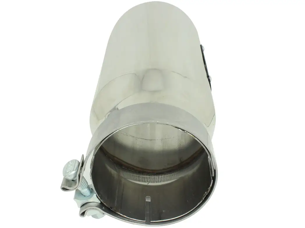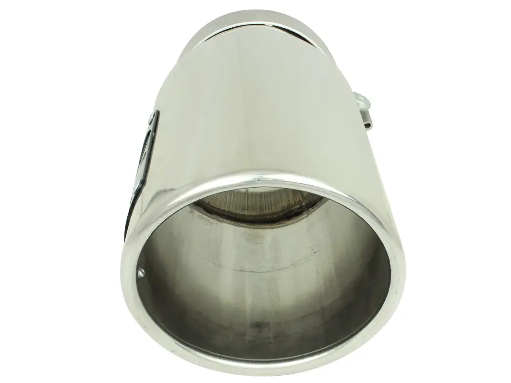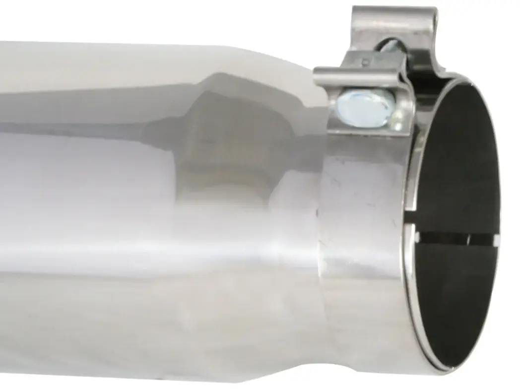 The polished aFe 304 stainless steel exhaust tip is designed to fit 4" exhaust systems. A 304 stainless steel band clamp ensures a very secure grip. Finally, this exhaust tip features a stainless steel laser-cut logo plate for an aggressive style. With a 4" inlet, 5" outlet and a 12" inch length, this single-walled, slash cut rolled tip is a nice compliment for any 4" exhaust system.