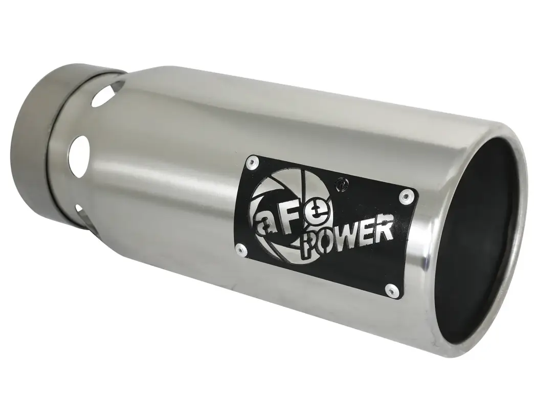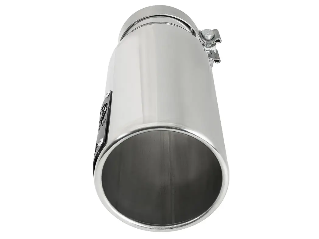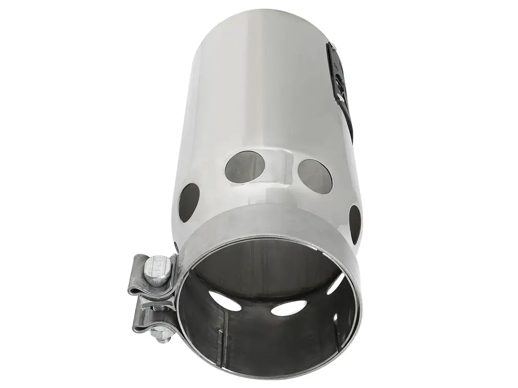 aFe Power is proud to introduce an all new intercooled exhaust tip. This tip comes with a high luster polished finish and is designed to fit 4" exhaust systems. With a 4" inlet x 5" outlet and 12" inch length, this single-walled, angle cut rolled tip comes with intercooling vents and a unique laser-cut aFe Power logo plate riveted on for an aggressive style.