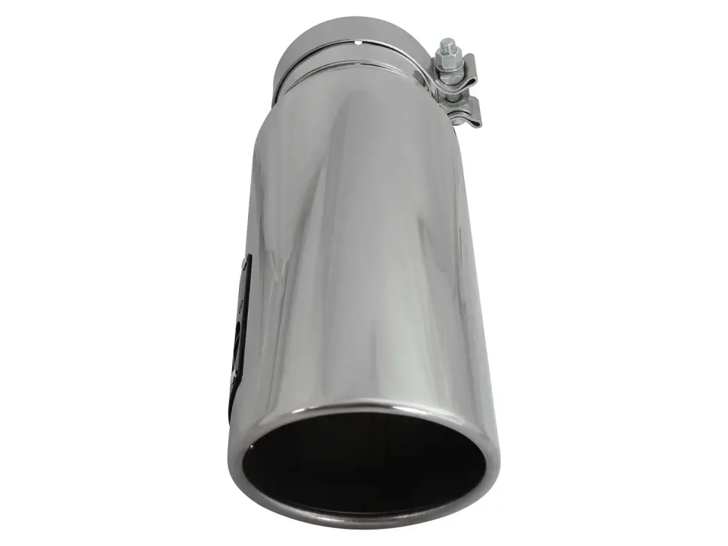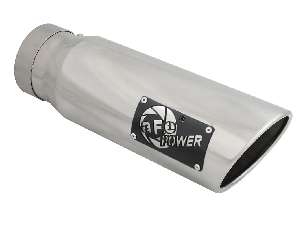 aFe Power is proud to introduce the all new diesel exhaust tip. This tip comes with a mirror polished finish and is designed to fit 4" exhaust systems. With a 4" inlet x 5" outlet and 15" inch length, this single-walled, angle cut rolled tip comes with a unique laser-cut aFe Power logo plate riveted on for an aggressive style.