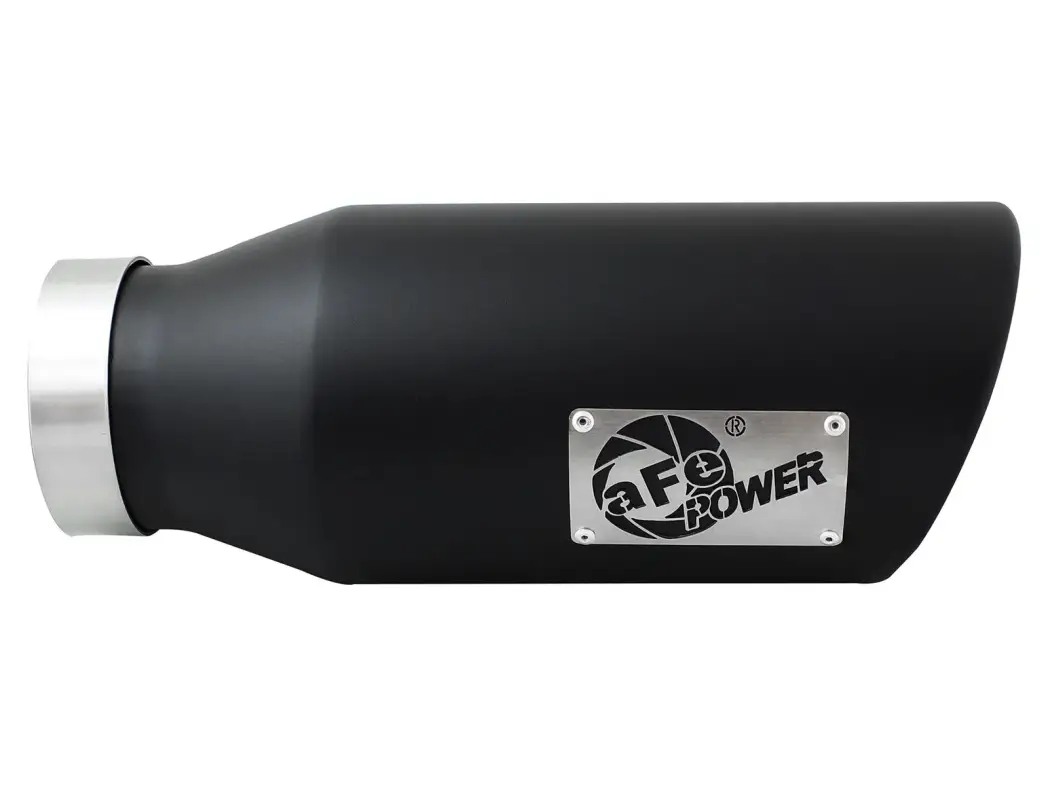 aFe Power is proud to introduce the all new diesel exhaust tip. This tip comes with a black finish and is designed to fit 4" exhaust systems. With a 4" inlet x 6" outlet and 15" inch length, this single-walled, angle cut rolled tip comes with a unique laser-cut aFe Power logo plate riveted on for an aggressive style.