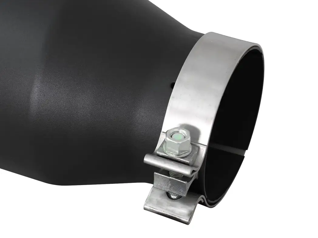 aFe Power is proud to introduce the all new diesel exhaust tip. This tip comes with a black finish and is designed to fit 4" exhaust systems. With a 4" inlet x 6" outlet and 15" inch length, this single-walled, angle cut rolled tip comes with a unique laser-cut aFe Power logo plate riveted on for an aggressive style.