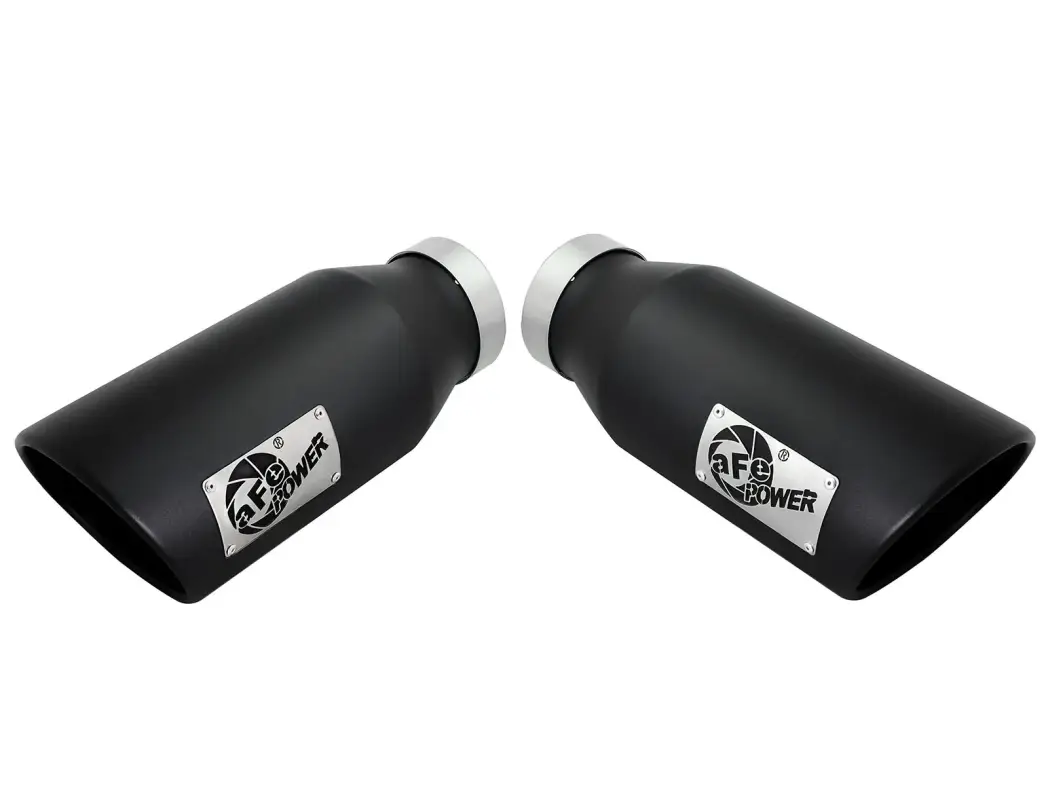 aFe Power is proud to introduce the all new exhaust tips. These tips come as set and have a black finish. The tips are designed to fit 4" dual exhaust systems. With a 4" inlet x 6" outlet and 15" inch length, these single-walled, angle cut rolled tips comes with unique laser-cut aFe Power logo plates riveted on for an aggressive style.
