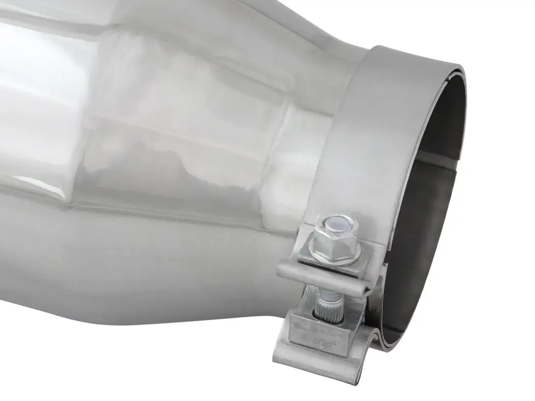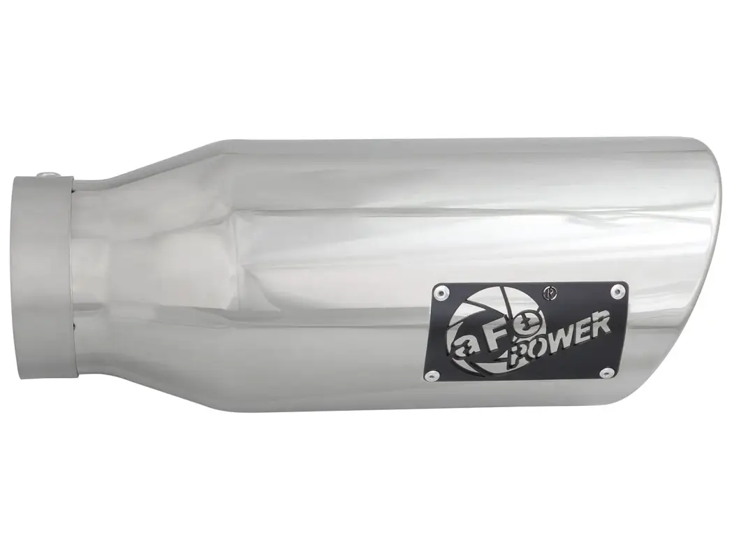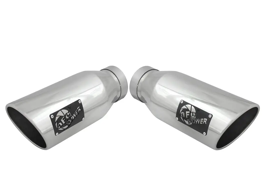 aFe Power is proud to introduce the all new exhaust tips. These tips come as set and have a mirror polished finish. The tips are designed to fit 4" dual exhaust systems. With a 4" inlet x 6" outlet and 15" inch length, these single-walled, angle cut rolled tips comes with unique laser-cut aFe Power logo plates riveted on for an aggressive style.