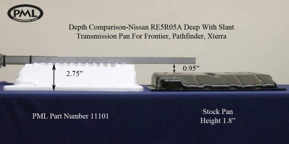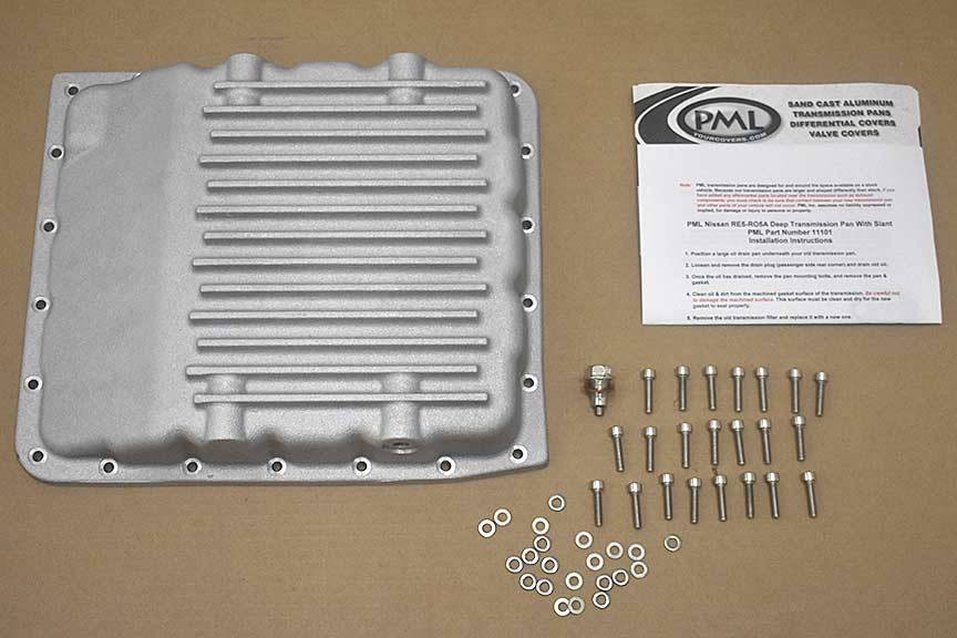 PML designed this transmission pan for Frontier, Pathfinder, Xterra, Cars, and Trucks with Skid Plates. This heavy duty transmission oil pan fits the Nissan RE5R05A 5 speed transmission.