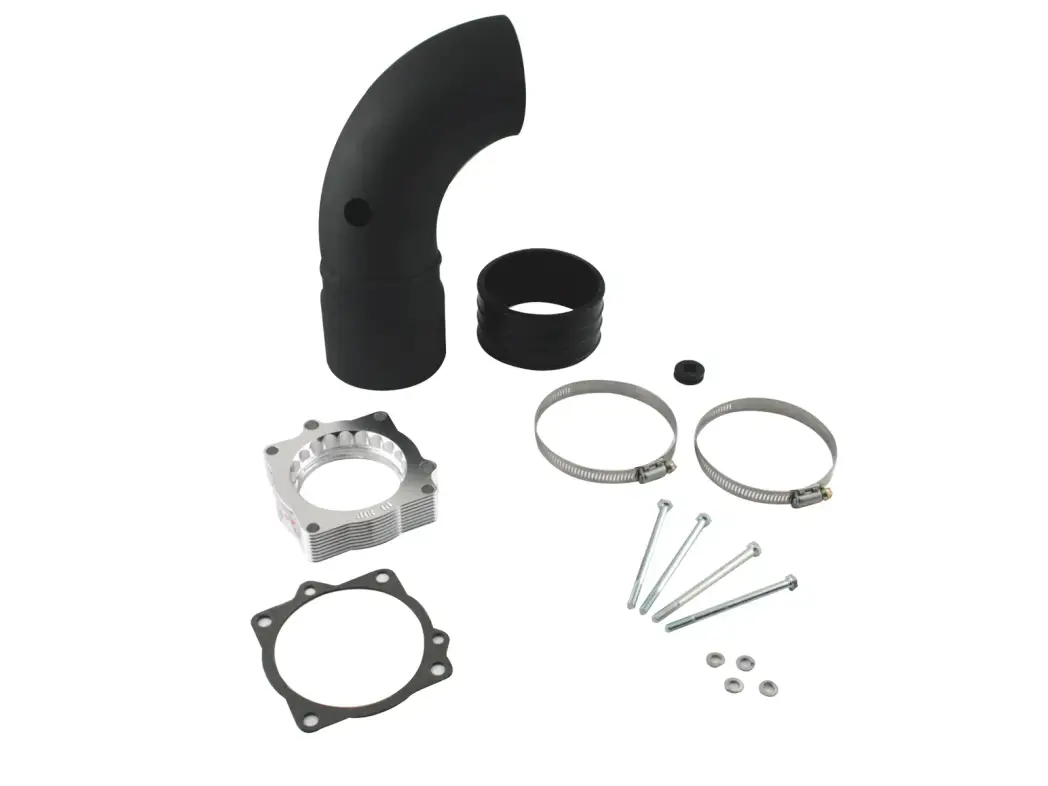 This Silver Bullet throttle body spacer uses all factory mounting locations, making for a hassle-free installation. A supplied gasket provides a perfect seal. An aluminum tube and coupling are included in the kit to guarantee a perfect fitment with the factory air intake system.