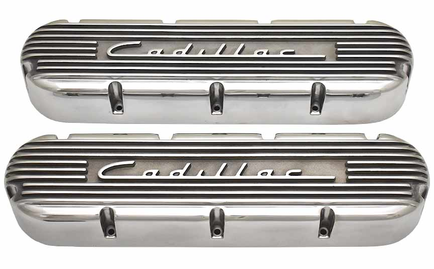 These valve covers feature the classic "1949" style CADILLAC script. The script gives an old school feeling to the more modern, powerful Cadillac V8 engines. Nine fins complement the script to complete the design.