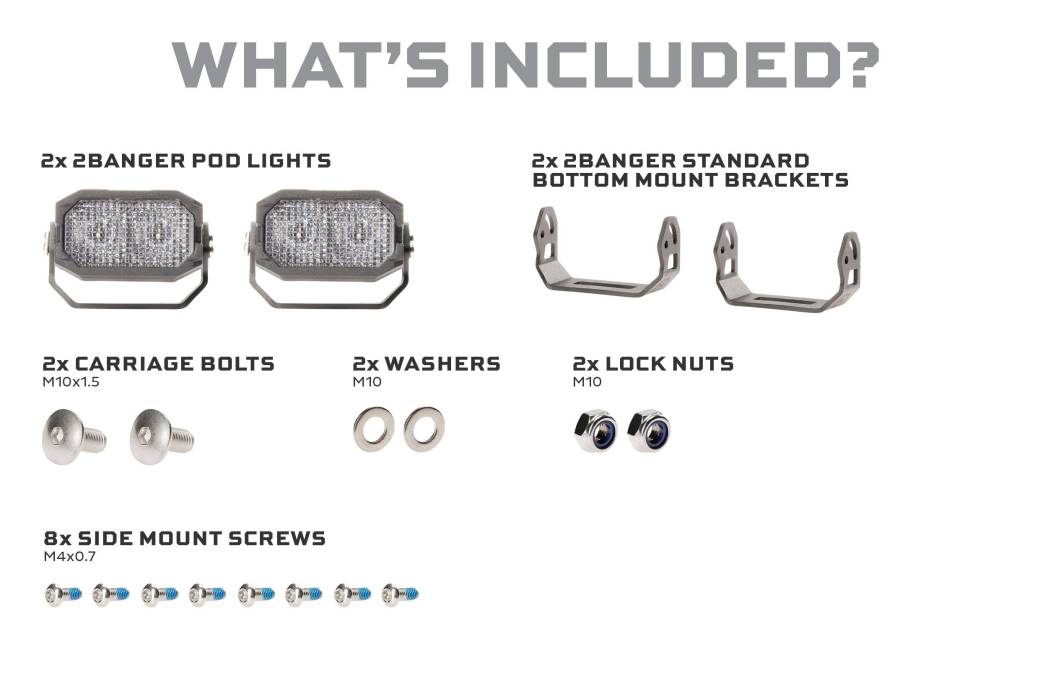 VERSATILITY: The 2Banger can be mounted alone, or linked together into a serious light bar. Each set of pods includes universal pedestal mounts for an easy install on any flat surface, like your steel bumper or the the wide-variety of application-specific A-Pillar brackets we offer. The BangerBar links offer a turn-key way to bolt your Bangers together into a bespoke light bar, where you spec the color of the light. You spec the beam optics. You set the radius. And then you destroy the darkness. For more details, look for product listings dedicated to the BangerBars.