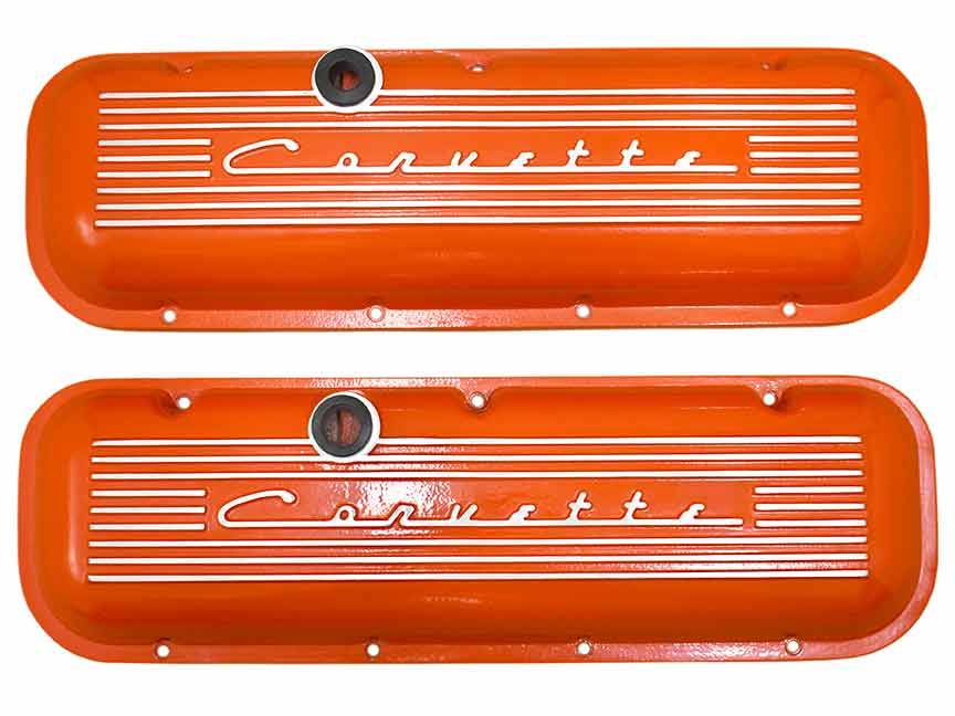 9096-OR-2P | PML Cover Valve Covers For Chevy Big Block, 396, 427, 454, 502, CHEVROLET Script, Standard | Orange Powder Coat Finish