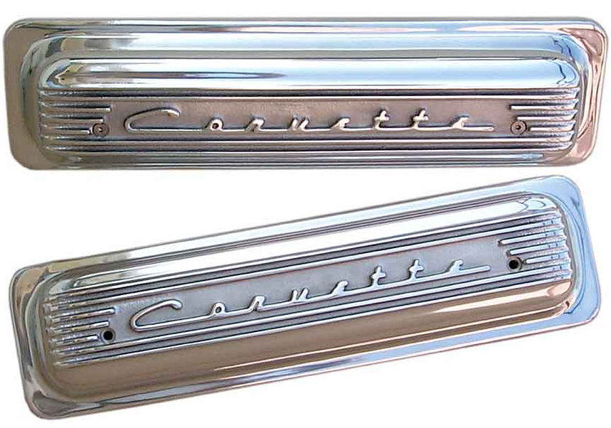 11041-P | PML Cover Valve Covers Center Bolt, CORVETTE Script And Fins For Chevy Small Block, GM Generation II LT1 and LT4 Engines | Polish Finish
