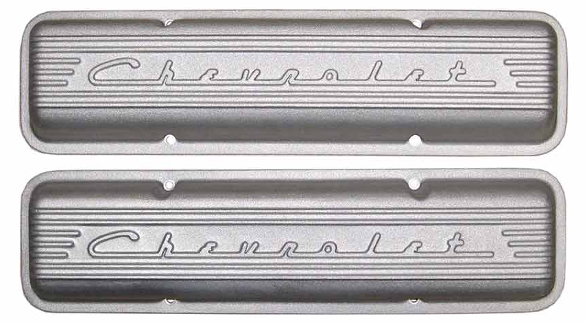 10430-AC | PML Cover Valve Covers Chevy Small Block, 265, 283, 327, 350 & 400 Engines, CHEVROLET Script & Fins | Natural As-Cast Finish