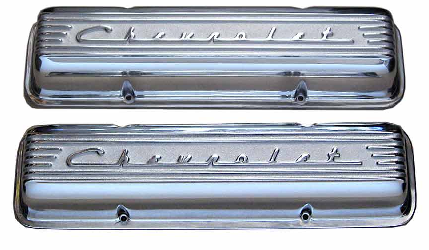 PML designed these small block Chevy valve covers with fins and CHEVROLET script for a classic look to dress up the engine compartment.eel.