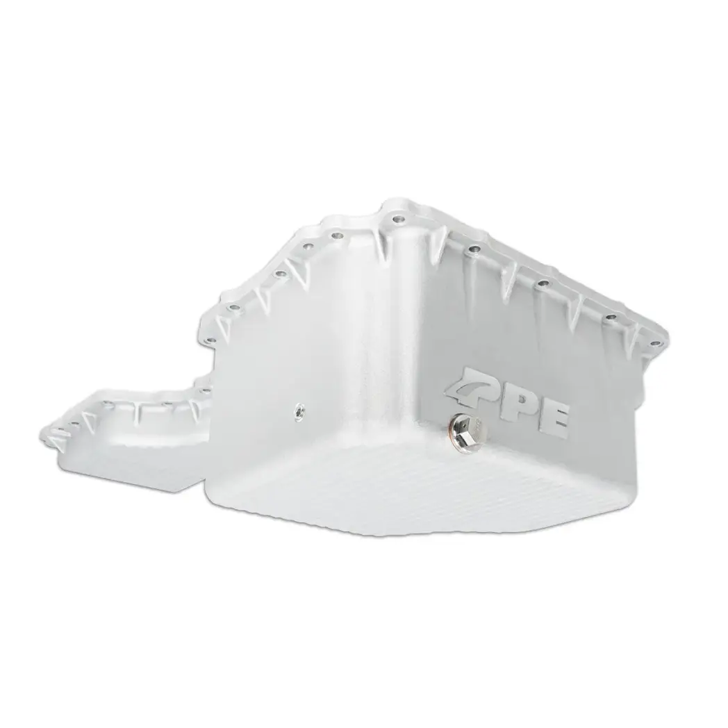 Upgrade from the stock stamped-steel oil pan to the PPE Heavy-Duty High-Capacity Cast Aluminum Oil Pan for complete oil drainage, improved durability, enhanced cooling, and superior engine protection.