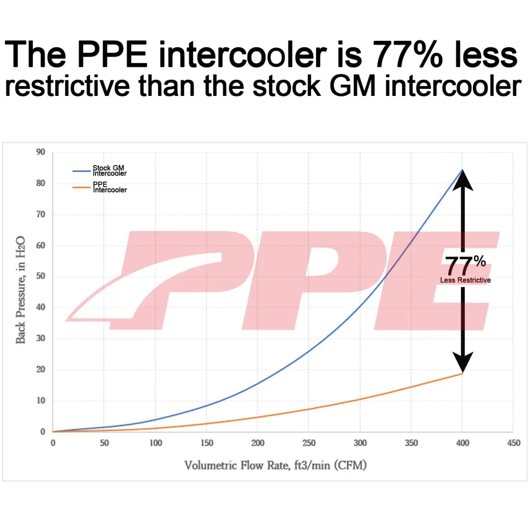 The PPE intercooler utilizes an all-aluminum, bar-and-plate cooler core with durable cast-aluminum, TIG-welded end tanks. Unlike the factory crimped plastic end tanks, this design offers significantly improved heat resistance and handles turbo boost effortlessly. The PPE intercooler features a 2.4 times larger (140% increase) cooler core and highly efficient cooling fins in both air and coolant passages. The increased core size, combined with fluid-dynamically optimized end tanks, reduces air pressure drop by 77%, resulting in easier and smoother engine breathing and less turbo stress.