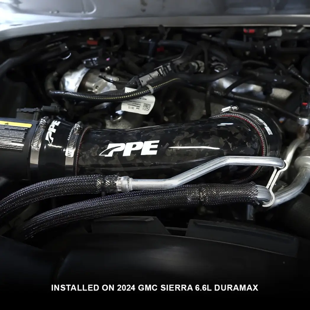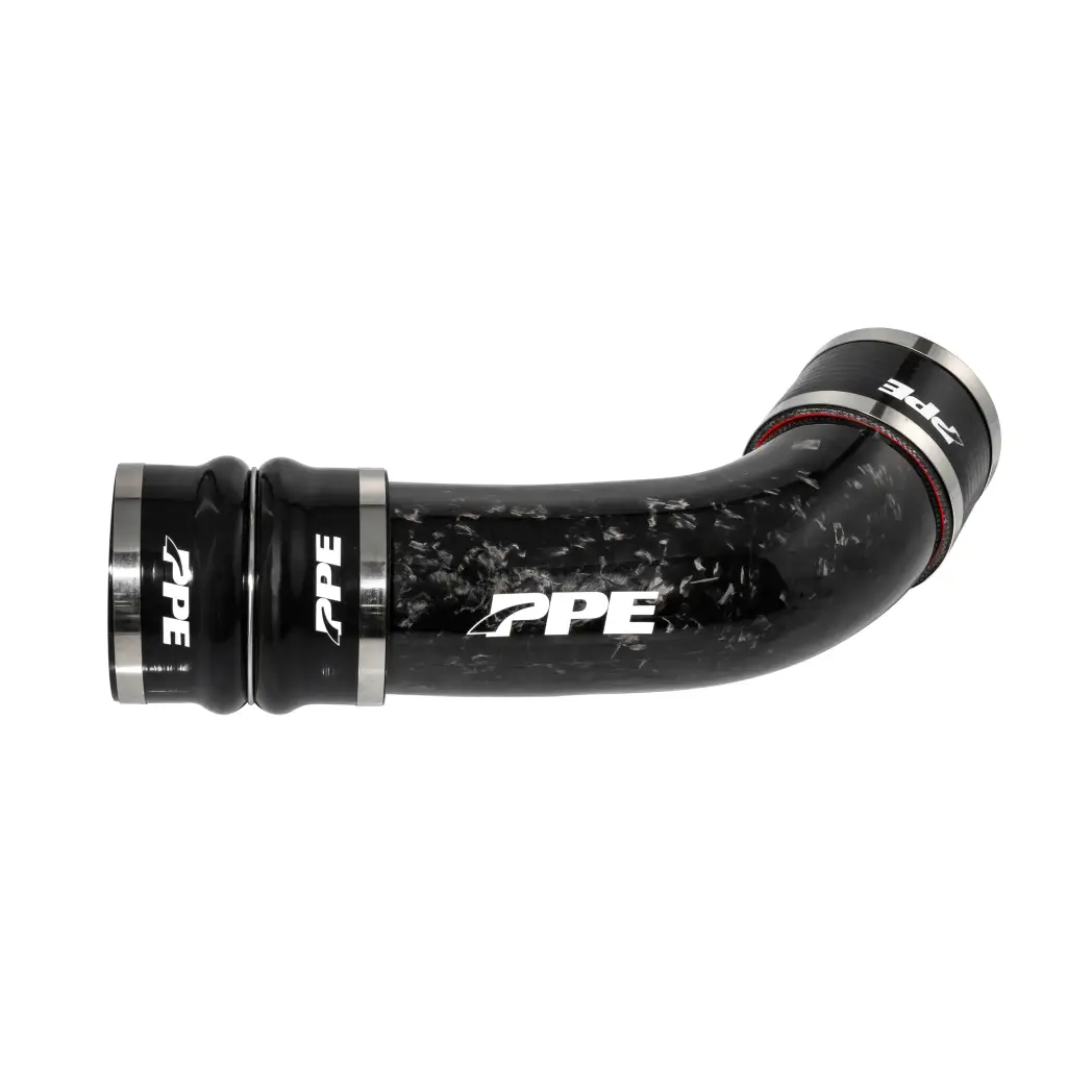 The PPE Zilla Carbon Fiber Turbo Inlet Tube replaces the restrictive, plastic intake tube and resonator that comes stock on your truck. The kit includes the PPE Zilla Carbon Fiber Turbo Inlet Tube, two Heavy-Duty 6mm 5ply Black Silicone Couplers, and stainless steel coupler clamps.