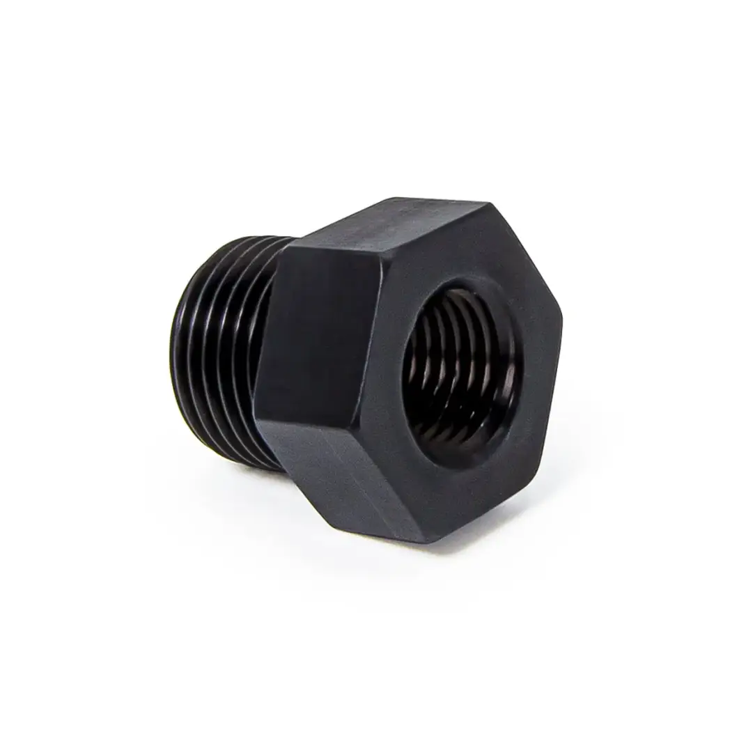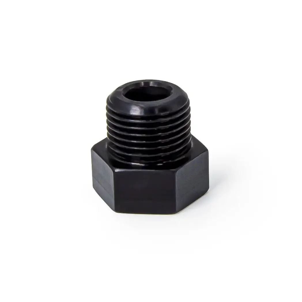 Turbo coolant fitting with female 1/4’’ pipe thread and male M18-1.5 thread. Hard anodized aluminum.