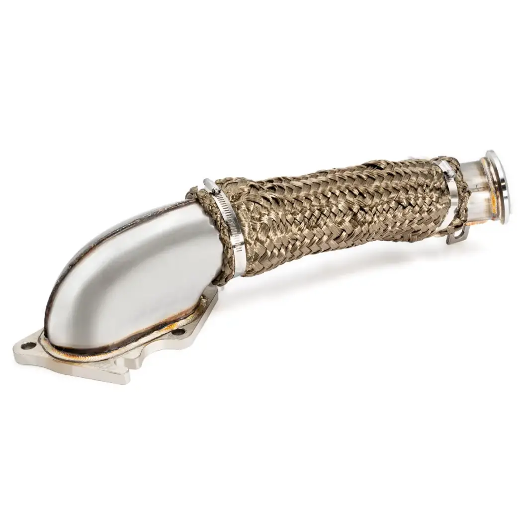 Upgrade your LB7 with the PPE Free-Flow Downpipe and eliminate the rusted, restrictive factory design. Crafted from durable 304 stainless steel, this downpipe features a robust half-inch turbine flange, a CNC-machined lower flange, and smooth, optimized transitions for unobstructed exhaust flow. To further enhance performance, it comes with a woven titanium sleeve that effectively insulates heat, protecting the engine bay.