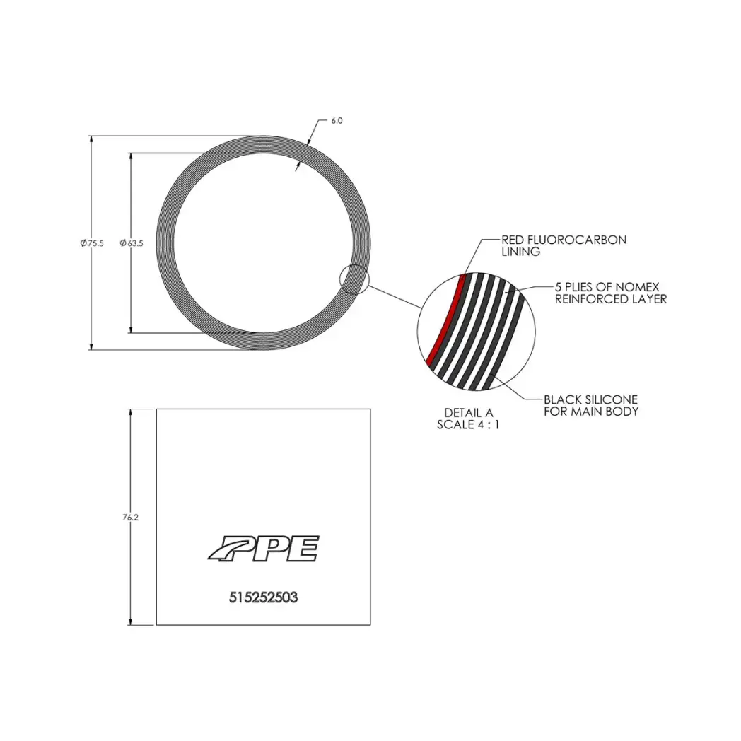 Each PPE Performance Silicone Hose is strengthened with 5 plies of Nomex reinforced fibers making them very tough. Fluorocarbon lining offers better lubricity (slippery and resistant to chemicals) and the silicone rubber construction ensures they can withstand constant boost pressures and temperatures from -76 degrees all the way to +437 degrees Fahrenheit. PPE silicone will maintain structural integrity even when subject to high boost pressures throughout the temperature range. In short, PPE Performance Silicone Hoses will not blow out like a stock hose will.