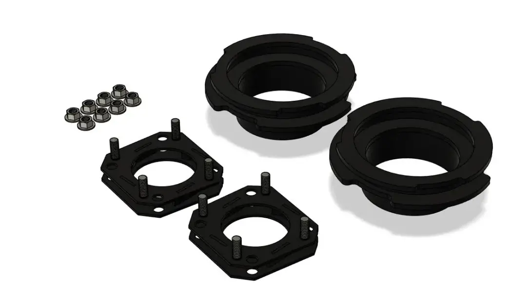 Each kit contains two front strut spacers, two rear spring spacers, and all the required hardware.