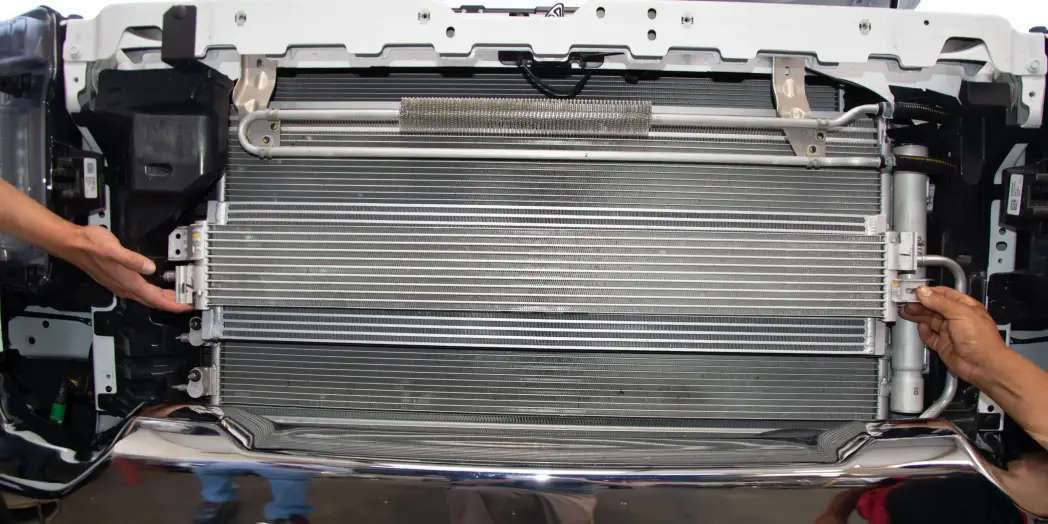 The PPE all-aluminum transmission cooler features a massive 395 cubic-inch core – that’s 3.28 times the volume of the stock cooler. The 80% larger frontal area increases its airflow exposure, enhancing heat dissipation. Its dense, louvered external fins maximize heat transfer to ambient air, helping achieve a temperature drop of up to 45°F to keep your transmission within the optimal temperature range – even under demanding conditions.