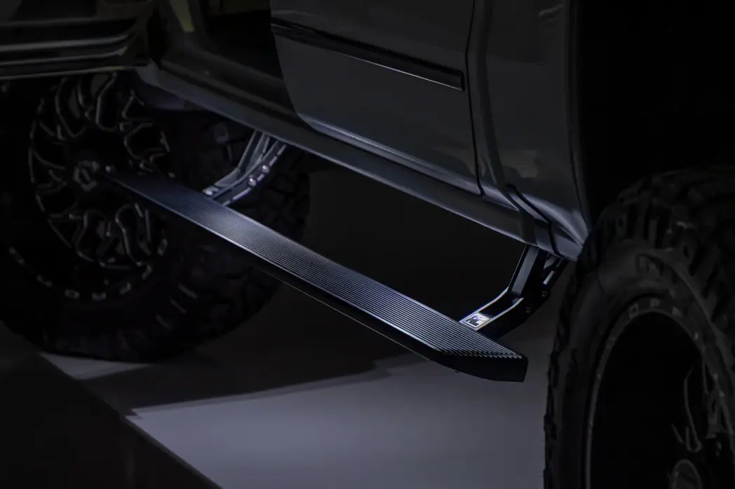 HT-Series Power Running Boards: Step Up in Style: Sidesteps have evolved, and the HT-Series Power Running Boards take entry and exit to a premium level. These automatic, retractable running boards deploy smoothly when the door opens and tuck tight under the rocker panel when closed for a clean, factory-style appearance. A wide 6-inch anti-slip stepping surface provides confident footing in all conditions, while integrated LED courtesy lights illuminate the board when deployed and shut off when retracted for a sleek, streamlined look.