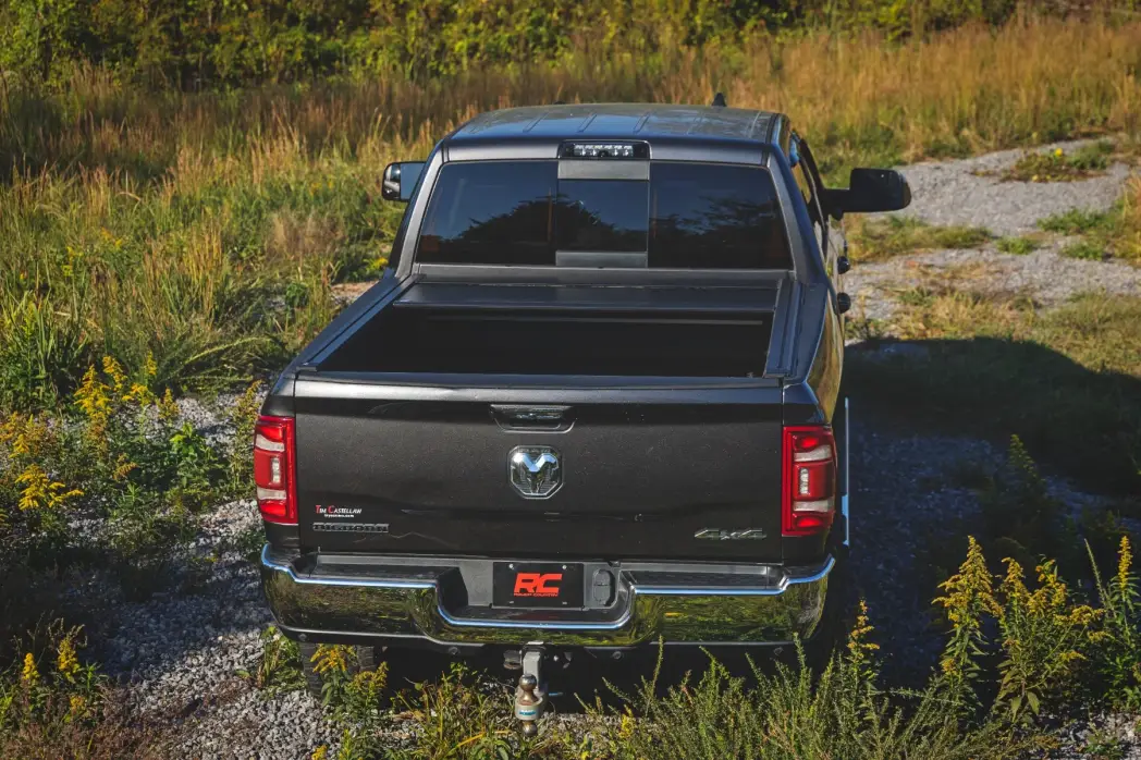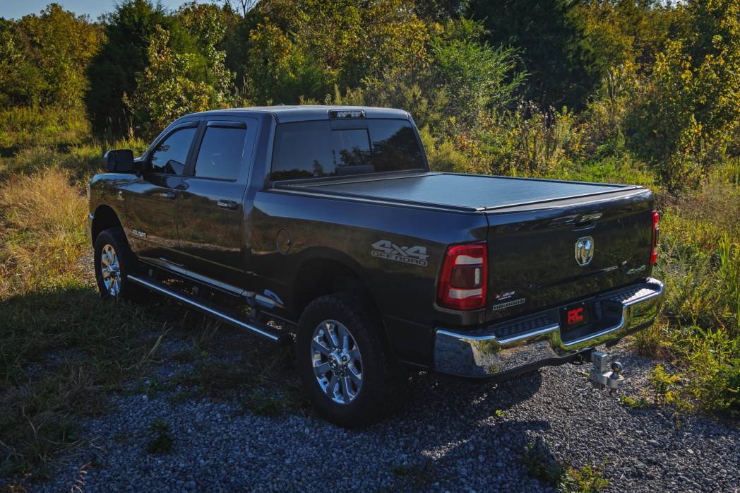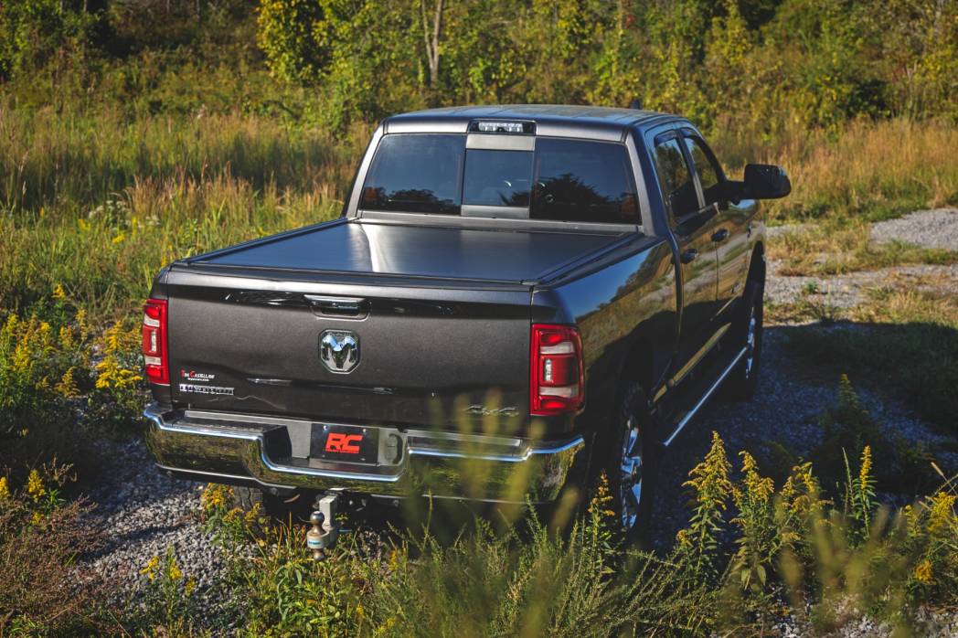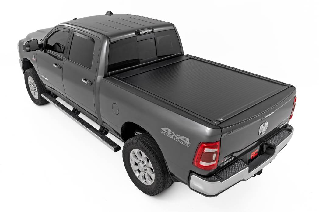 Rugged Protection with Everyday Functionality: Shield your gear from the elements and elevate your truck's style with Rough Country's Powered Retractable Bed Cover for Ram 1500/2500/3500 models. Built from heavy-duty aluminum and finished in a stealthy matte black coating, this cover offers long-lasting durability that stands up to harsh weather, off-road abuse, and daily wear. A UV-resistant finish prevents fading, while sealed ball bearings deliver smooth, maintenance-free operation every time you open or close the cover.