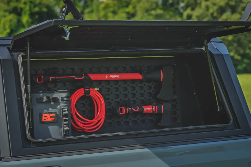 Maximize your truck's storage potential with the Rough Country Bed Cap Molle Panel Storage Bin. Designed as the perfect addition to the Rough Country Bed Cap, this rugged Molle panel bin enhances organization and accessibility while maintaining a tough, trail-ready design. With a durable powder-coated finish, and integrated LED lighting, this storage solution is built for convenience and reliability.