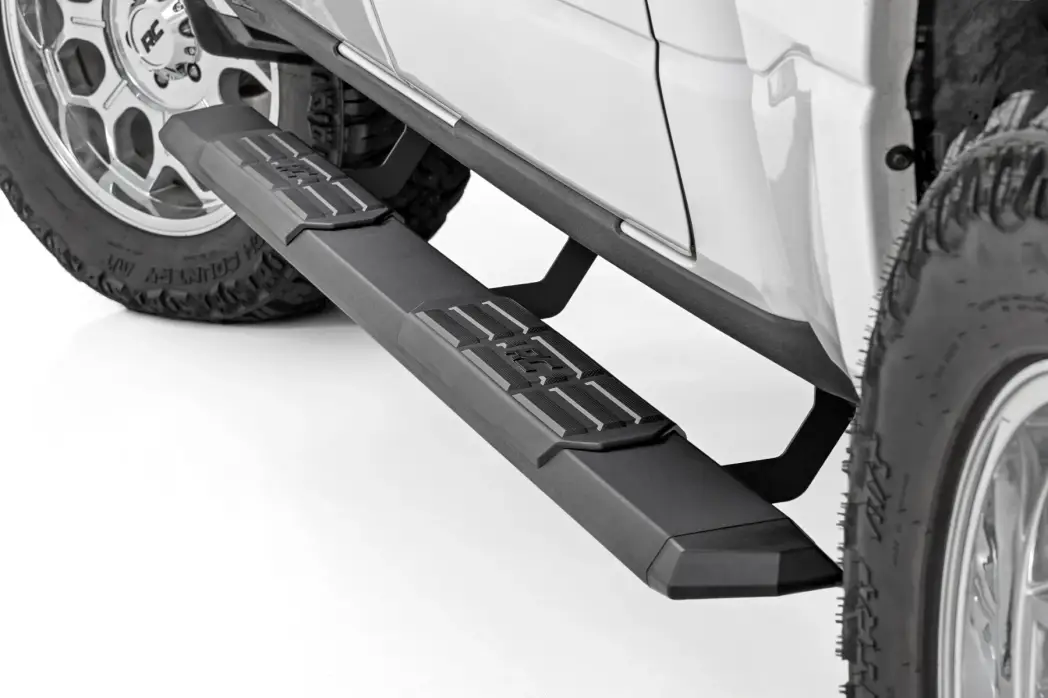 Rugged Style Meets Unmatched Functionality: Upgrade your Ram 1500/1500 TRX with Rough Country's TR2 Aluminum Running Boards. Engineered for durability and style, the TR2 provides a stable, full-length 5" stepping platform for every adventure, on or off the road.