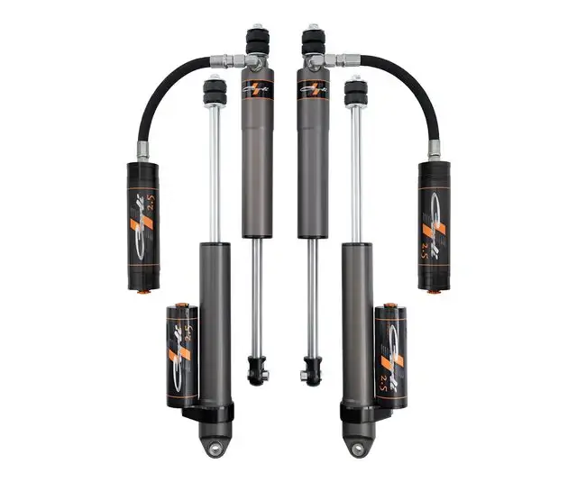 - 2.5" Aluminum Body Reservoir shocks finished in a gray hard coat