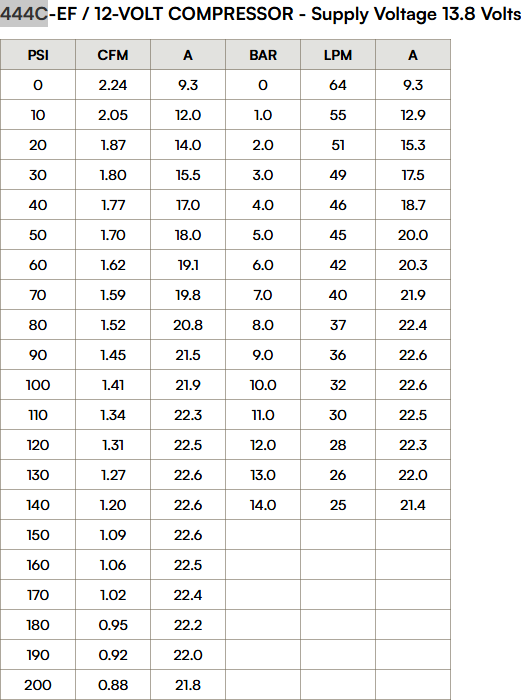 444C-EF (200 PSI) Ideal for tire inflation management, air suspension and general needs where 200PSI is needed. Very reliable and affordable for how well it performs. 100% Duty Cycle @ 100PSI.