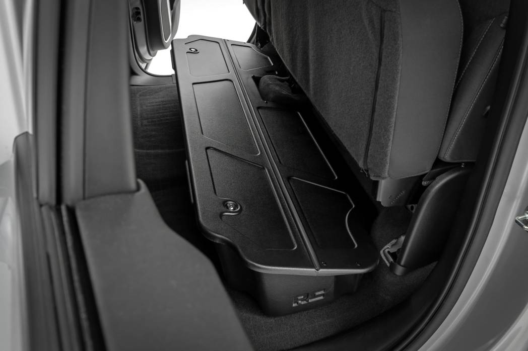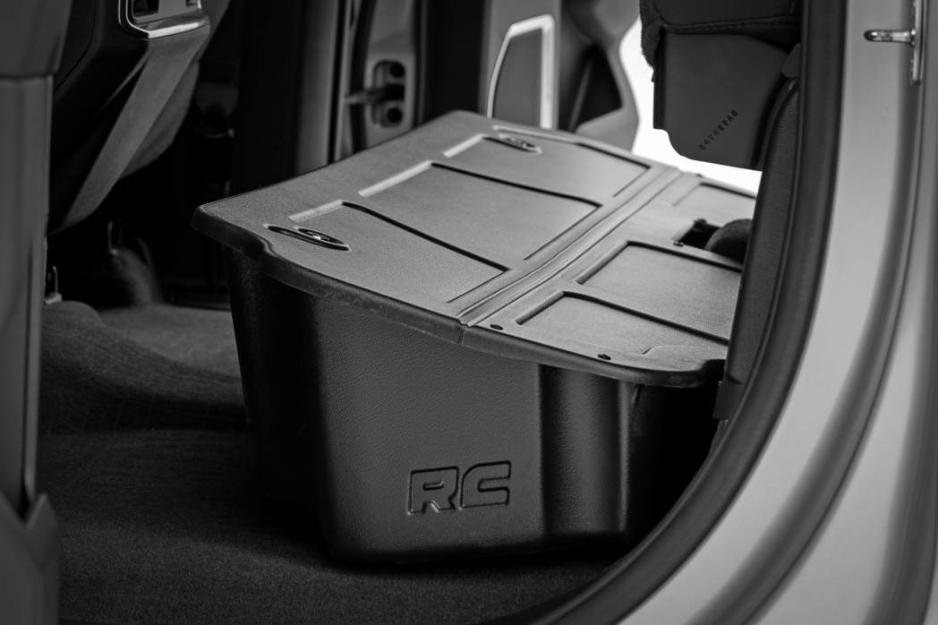 Take Control of Your Cab Storage: Keep your interior clean, organized, and clutter free with Rough Country's Custom-Fit Under Seat Storage Compartment for the Chevy Silverado and GMC Sierra. Designed to transform unused space beneath your rear seat into practical storage, this convenient solution provides the perfect place to store tools, recovery gear, emergency equipment, and everyday essentials while keeping them out of sight but always within reach.