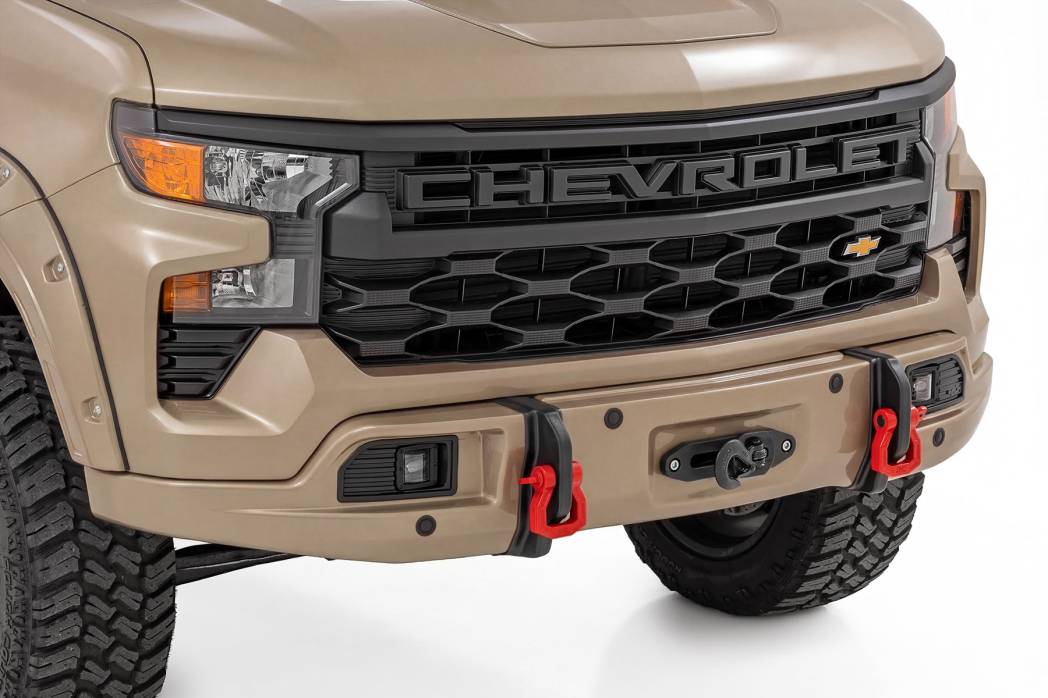 13007-GTL | Rough Country FXS Front Bumper For Chevrolet Silverado 1500 2WD/4WD | GTL, Sand Dune Paint Code, With PRO12000S Winch