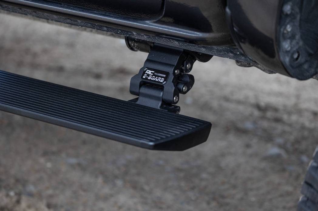 Premium Construction. The Rough Country E-Board Steps combine durability, strength, and style. These 6" all-season steps are made from lightweight yet durable aluminum and can support up to 660 lbs per side. Equipped with dual motor technology, these steps can handle anything Mother Nature throws their way. They feature an automatic 'SAFE-STOP' mechanism that engages if a blockage is detected and include an interior bypass switch for manual override. So whether you're heading out on a weekend errand or loading up for a camping trip, our electric steps offer reliable protection for all your adventures.