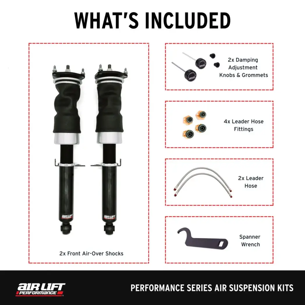 Kit Includes: Complete front Air Suspension kit with set of (2) front dampers with (2) air springs, (1) spanner wrench, (2) damping adjustment knobs, (2) damping knob grommets, (2) stainless leader lines, (2) 1/4" FNPT x 1/4" PTC fittings and (2) 1/4" FNPT x 3/8" PTC fittings.