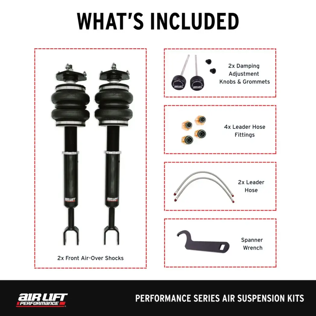 Complete front Air Suspension kit with set of (2) front dampers with (2) air springs, (1) spanner wrench, (2) damping adjustment knobs, (2) damping knob grommets, (2) stainless leader lines, (2) 1/4" FNPT x 1/4" PTC fittings and (2) 1/4" FNPT x 3/8" PTC fittings.
