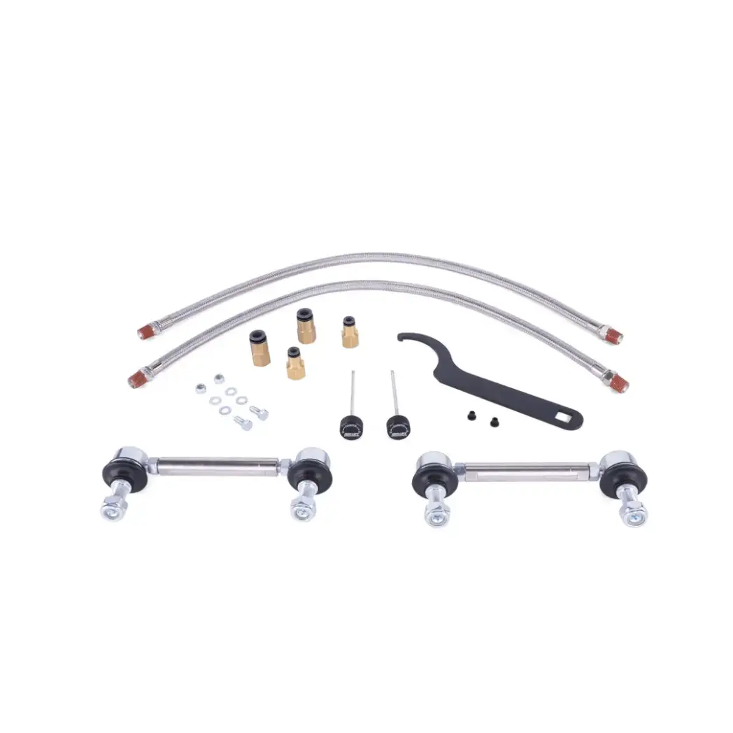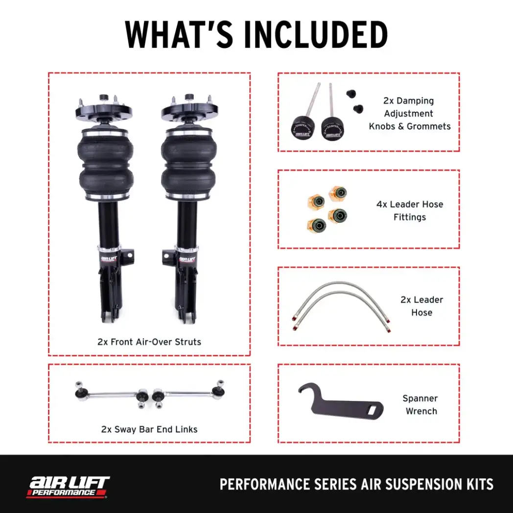 Complete front Air Suspension kit with set of (2) front dampers with (2) air springs, (1) spanner wrench, (2) damping adjustment knobs, (2) damping knob grommets, (2) stainless leader lines, (2) sway bar end links, (2) 1/4" FNPT x 1/4" PTC fittings and (2) 1/4" FNPT x 3/8" PTC fittings.