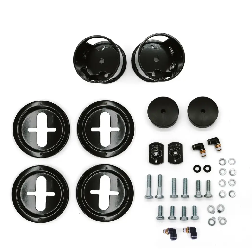 Complete front Air Suspension kit with set of (2) rear dampers with (2) air springs, (1) air spring mounting hardware, (1) spanner wrench, (2) damping adjustment knobs, (2) damping knob grommets, (2) 1/4" FNPT x 1/4" PTC fittings and (2) 1/4" FNPT x 3/8" PTC fittings.