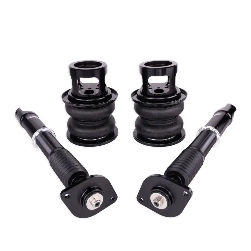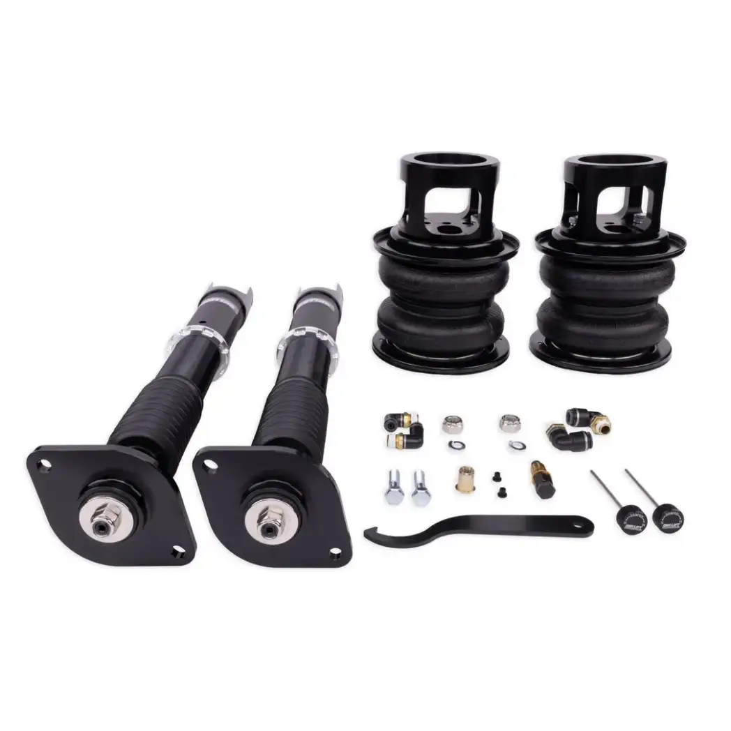 Complete rear Air Suspension kit with set of (2) rear dampers, (2) air springs, (1) vehicle specific bracket and hardware kit, (1) spanner wrench, (2) damping adjustment knobs, (2) damping knob grommets, (2) 1/4" FNPT x 1/4" PTC fittings and (2) 1/4" FNPT x 3/8" PTC fittings.