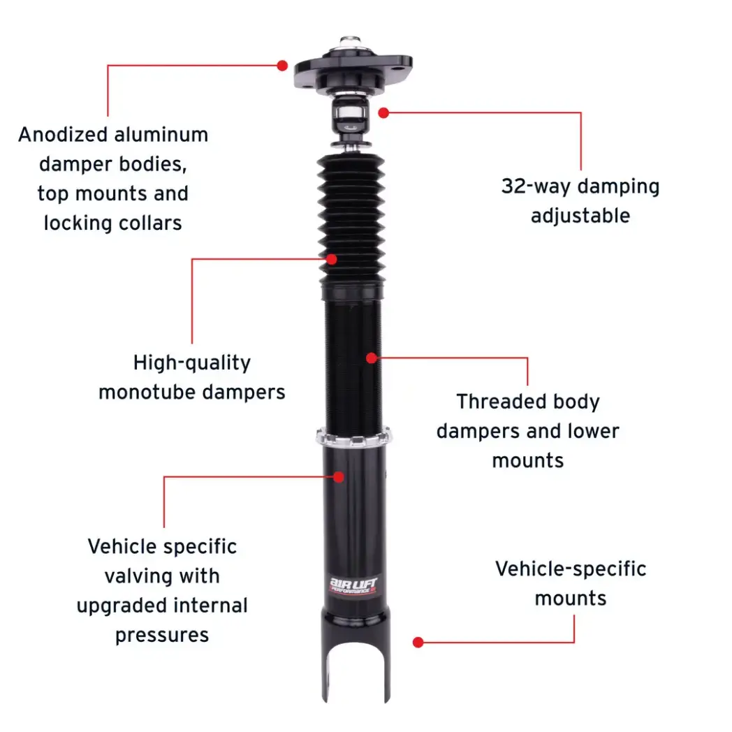 Lower your Infiniti G35 or Nissan 350z and raise your standards to Air Lift Performance. The rear kit features progressive-rate, double-bellows air springs and high-performance monotube shocks. With 32 levels of damping adjustability and threaded lower mounts, the shocks allow for a wide range of flexibility.