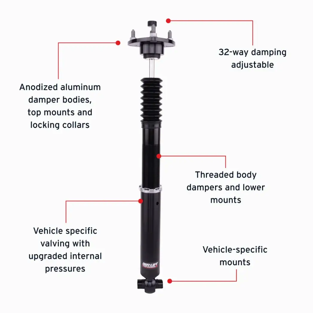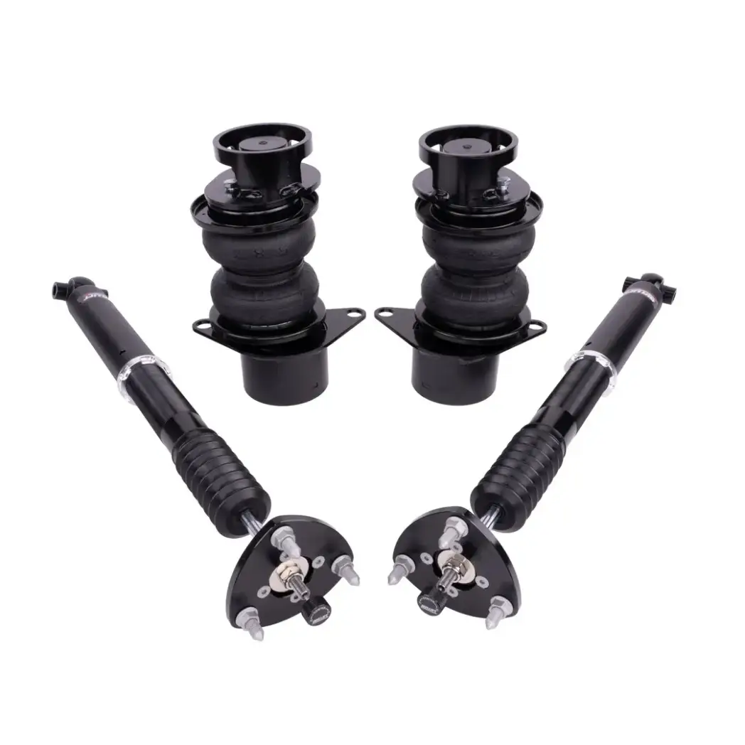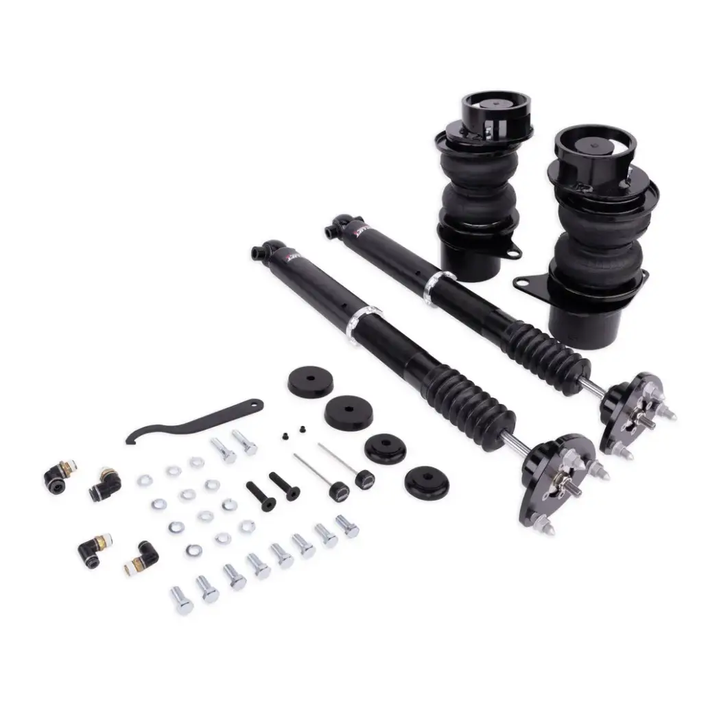 Complete rear Air Suspension kit with set of (2) rear dampers, (2) air springs, (4) roll plates, (1) set of vehicle specific brackets with hardware, (1) spanner wrench, (2) damping adjustment knobs, (2) damping knob grommets, (2) 1/4" FNPT x 1/4" PTC fittings and (2) 1/4" FNPT x 3/8" PTC fittings.