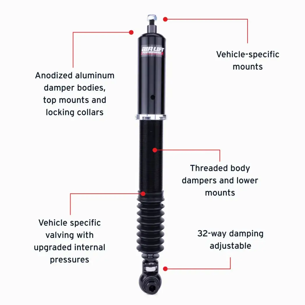 Lower your BMW and raise your standards to Air Lift Performance. The rear kit features progressive-rate, double-bellows air springs and high-performance monotube shocks. With 32 levels of damping adjustability and threaded lower mounts, the struts allow for a wide range of flexibility.