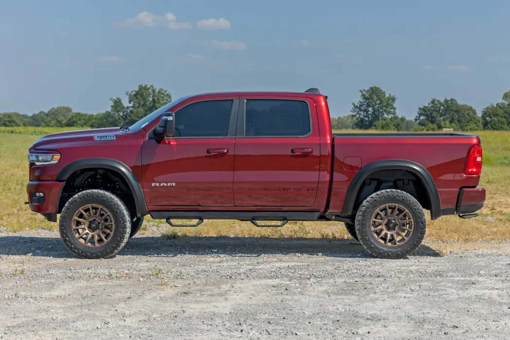 Style and Maximum Coverage: Elevate your fifth-generation Ram 1500 with Rough Country's Sport Style Fender Flares. These flares extend 1 inch for wider tires and offer a 5-inch height, giving your truck bold styling, extra clearance, and superior protection from rocks, mud, and road debris. Turn heads with a rugged, custom look that complements your truck's style while keeping it safe.